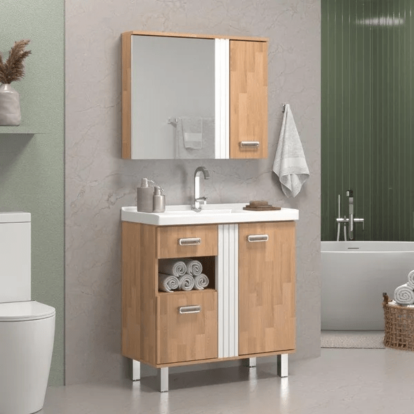 Móvel charmoso e funcional, ideal para quem busca praticidade e organização. Possui 1 porta, 1 gaveta, 1 nicho e 1 gavetão para roupas. A espelheira tem 2 portas, sendo uma com espelho colado e prateleira interna para melhor armazenamento.