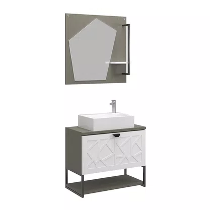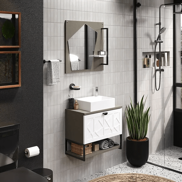 O Conjunto Tune combina modernidade e praticidade em um design compacto. A cuba de apoio em marmorite conta com furo lateral para a torneira e se encaixa muito bem em lavabos pequenos. O balcão possui porta basculante com detalhe geométrico e uma prateleira inferior sustentada por barra de ferro preto fosco, ideal para guardar itens do dia a dia. A espelheira segue a mesma linha moderna e traz uma prateleira charmosa para apoio.