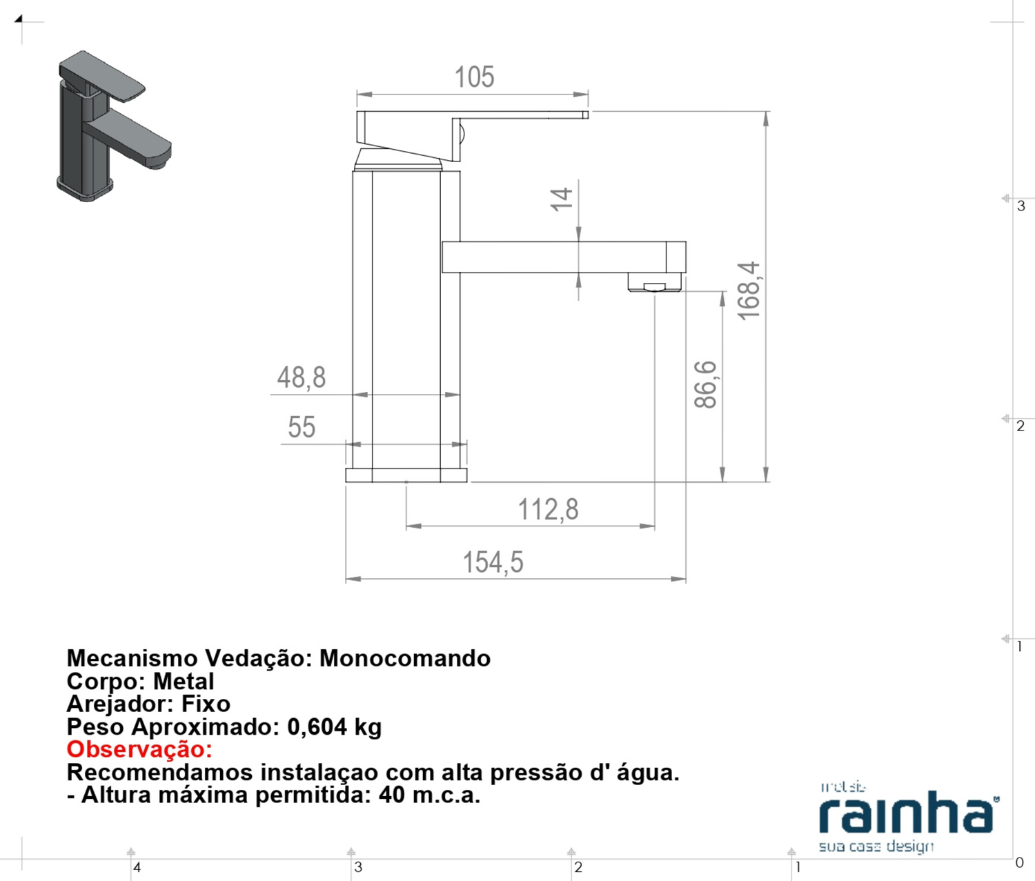 O Misturador Monocomando RAINHA 94530 é a escolha ideal para quem busca um toque de modernidade, funcionalidade e elegância no lavatório. Com acabamento Black Matte, ele traz um visual sofisticado e contemporâneo, perfeito para banheiros de alto padrão.